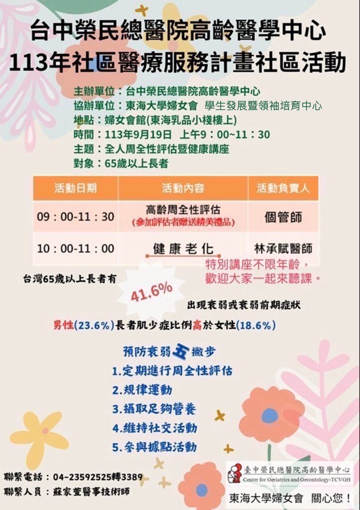 113年東海大學婦女會與臺中榮總舉辦周全性健康評估暨講座 2024 年 9 月 19 日 113年東海大學婦女會與臺中榮總舉辦周全性健康評估暨講座 時間:113/09/19 地點:.婦女會會館(乳品小棧二樓) 相關